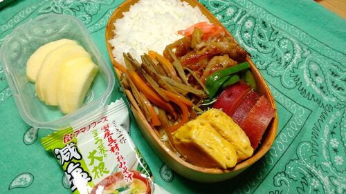 今日の弁当 豚肉生姜焼き 卵焼き きんぴらごぼう さつまいもレモン煮 千切りキャベツ
